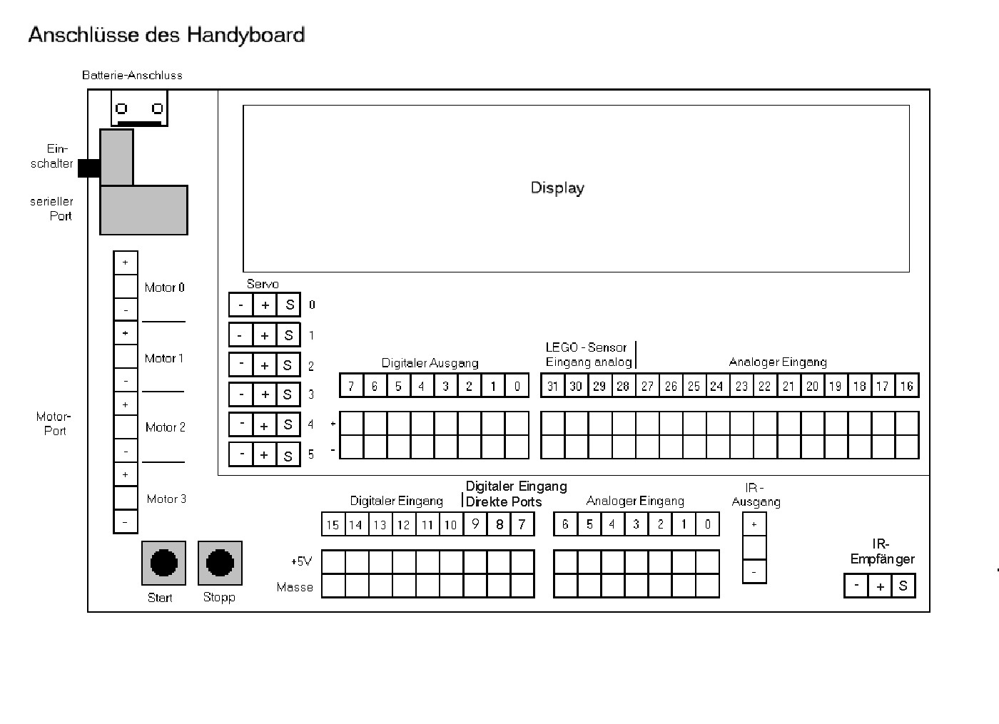 - Schemazeichnung des Handyboards mit der Lage der Anschlüsse |